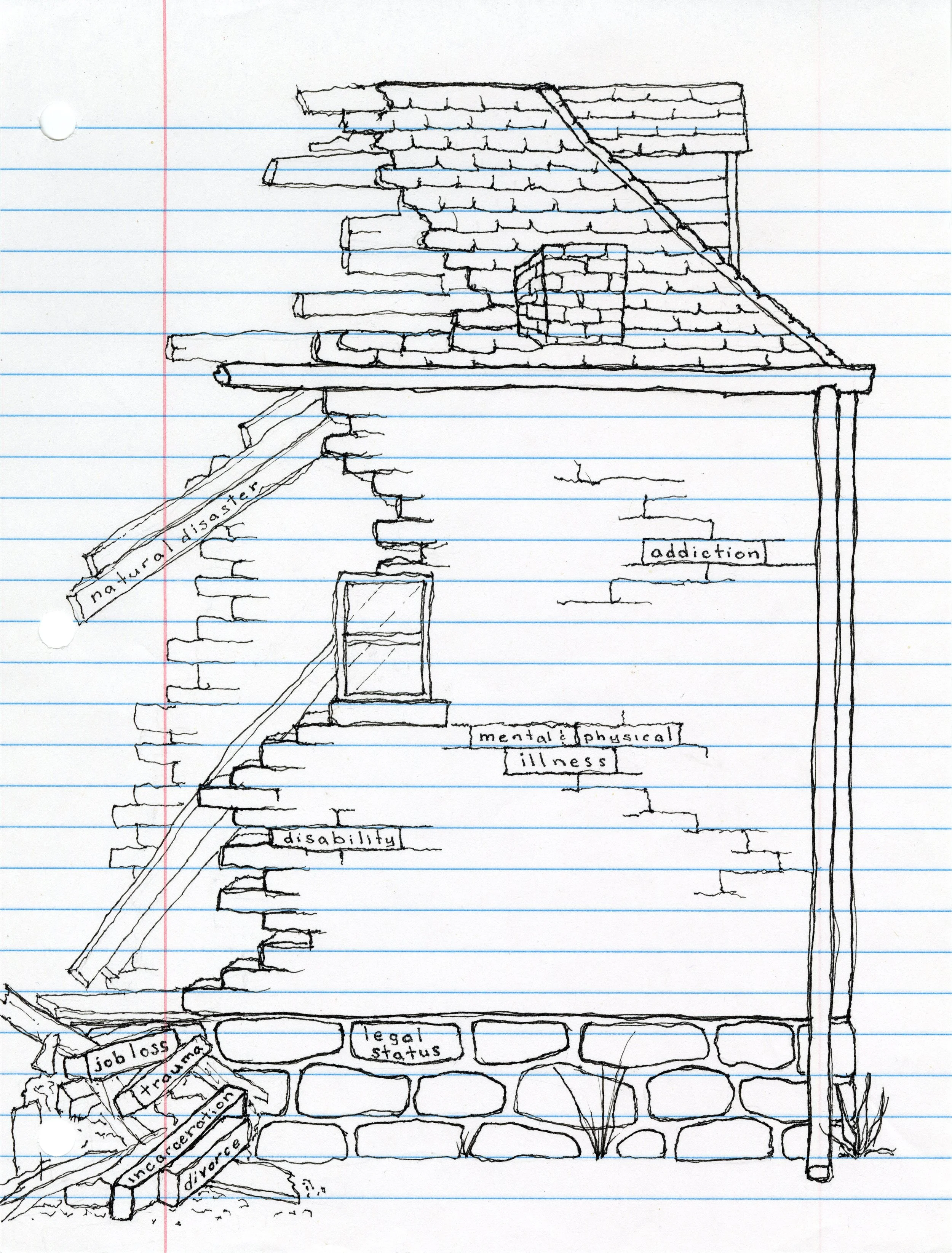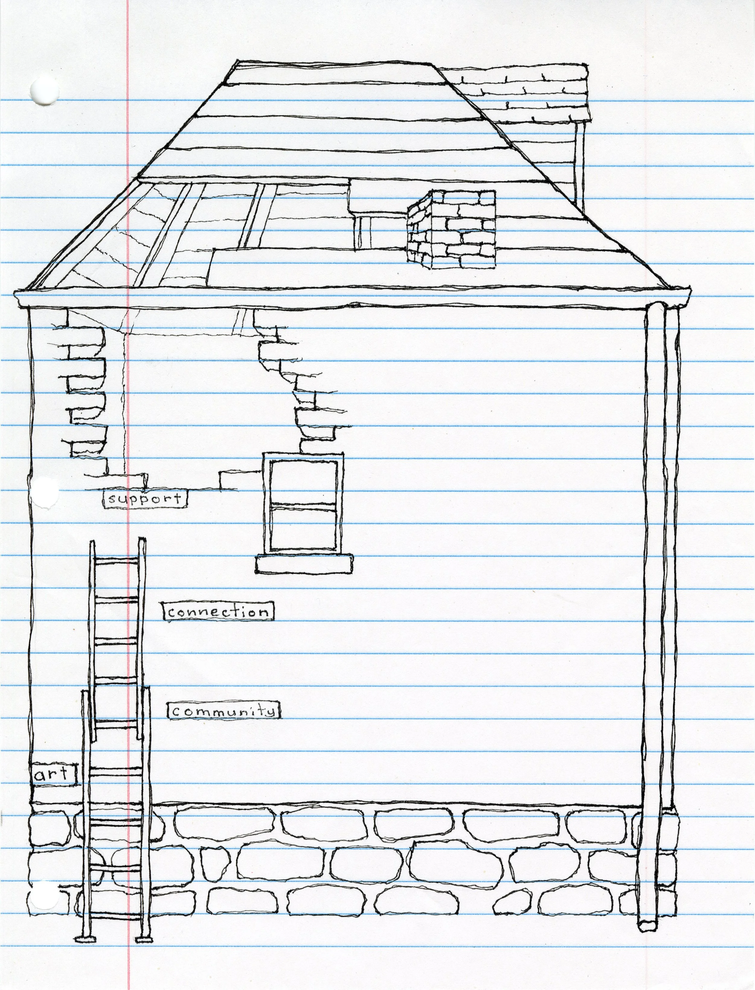 ~The middle images you see are ‘house’ drawings that represent literal and figurative ‘lived’ experience. First, a side view that shows decay, deterioration, and specific challenges to stability and structure.